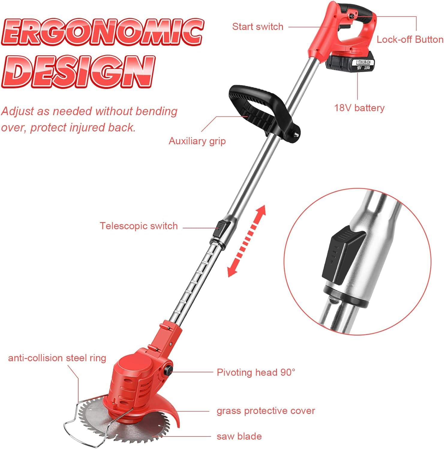 Versatile 2-in-1 Design: This unique tool combines the features of an edge trimmer and a lawnmower into one. It is ideal for edging along fences and flower beds because of the cutting head's 90° rotation and smooth mode switching. You can effortlessly enter narrow spaces that are inaccessible to conventional lawnmowers.
