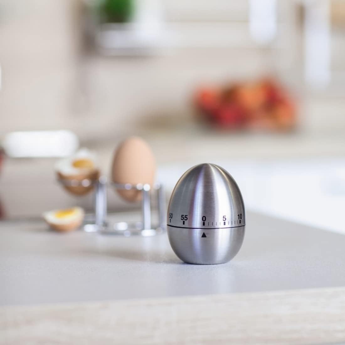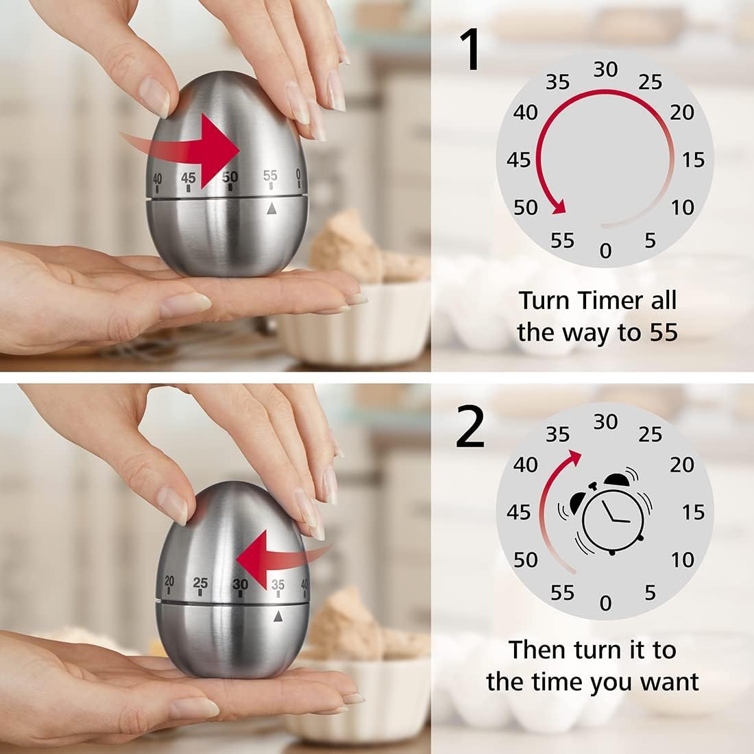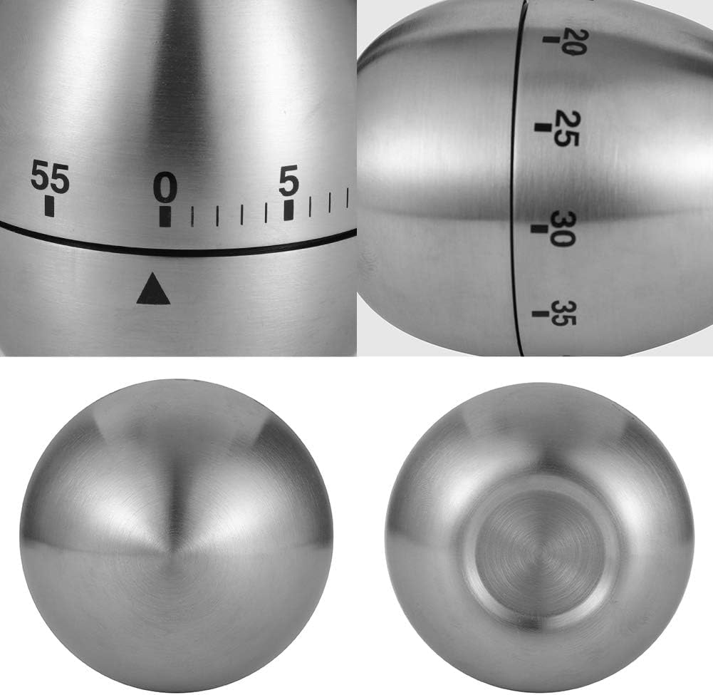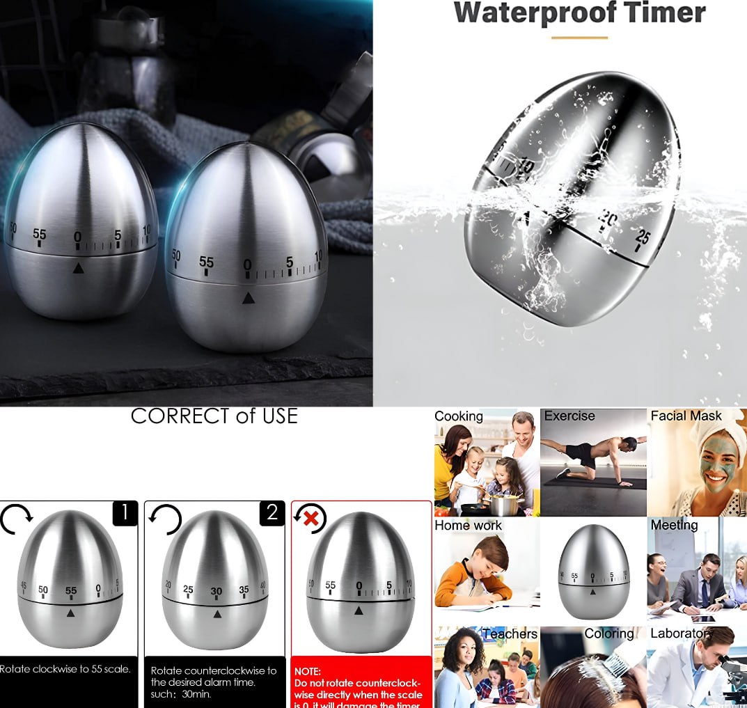 In Stockroduct description Product Name: Stainless Steel Egg Timer Material: stainless steel. Features: mechanical rotation, no battery required Purpose: Time to cook in the kitchen Dimensions: 8 x 6 x ... 6 cm. Product weight: 130 grams Instructions 1. When using, set the timer back to position 0 (do not turn counterclockwise). 2. Then turn clockwise to the scale 55. 3. Then turn the desired time (e.g. B. 15 minutes) clockwise on 15 scales. Read more