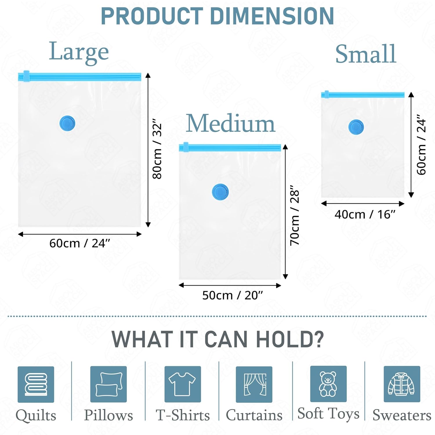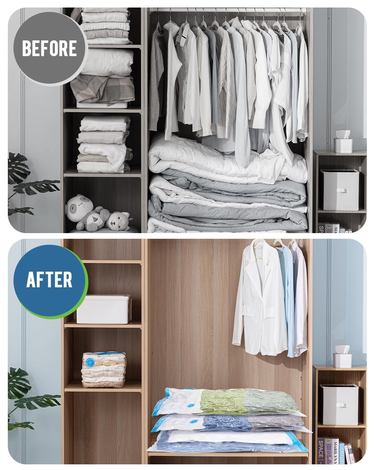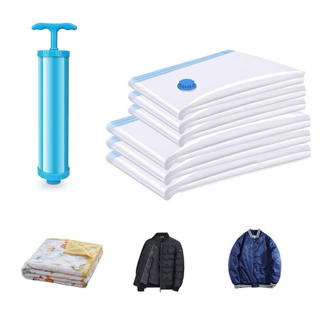 Save Space: The vacuum storage bags sets help you save 80% and bring more storage place for your wardrobes, closets, garages, basements, lofts, and suitcases, you can use these airtight bags when at home, travelling or moving house for a simple fix to your storage problems