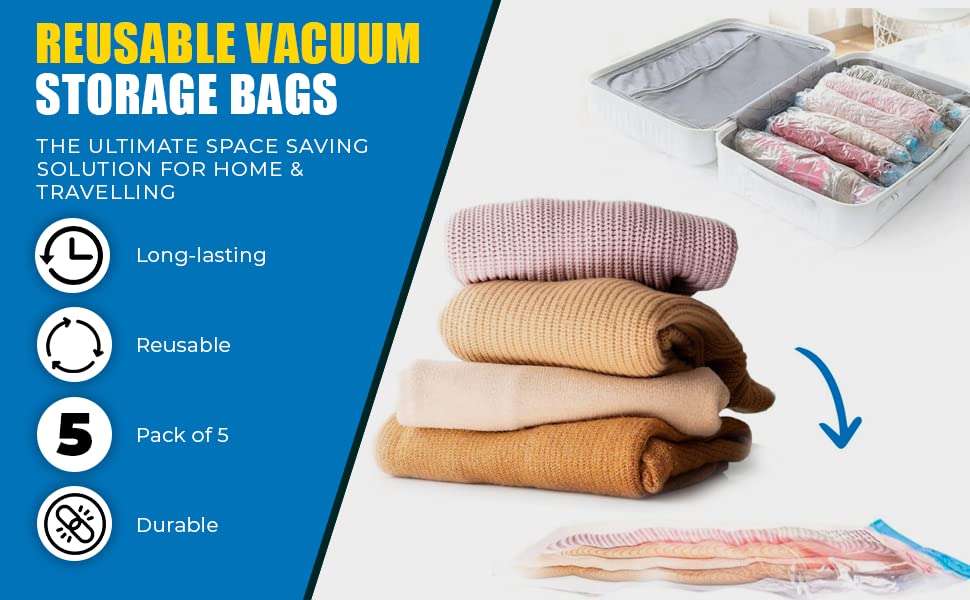 5 Pack Vacuum Compression Storage Bags With Pump, Space Saver Vacuum Sealer Bag for Clothes, Blankets, Pillows, Bedding, Double-Zip Transparent Reusable Vacuum Bag for Travel Packing (2S+2M+1LSize)