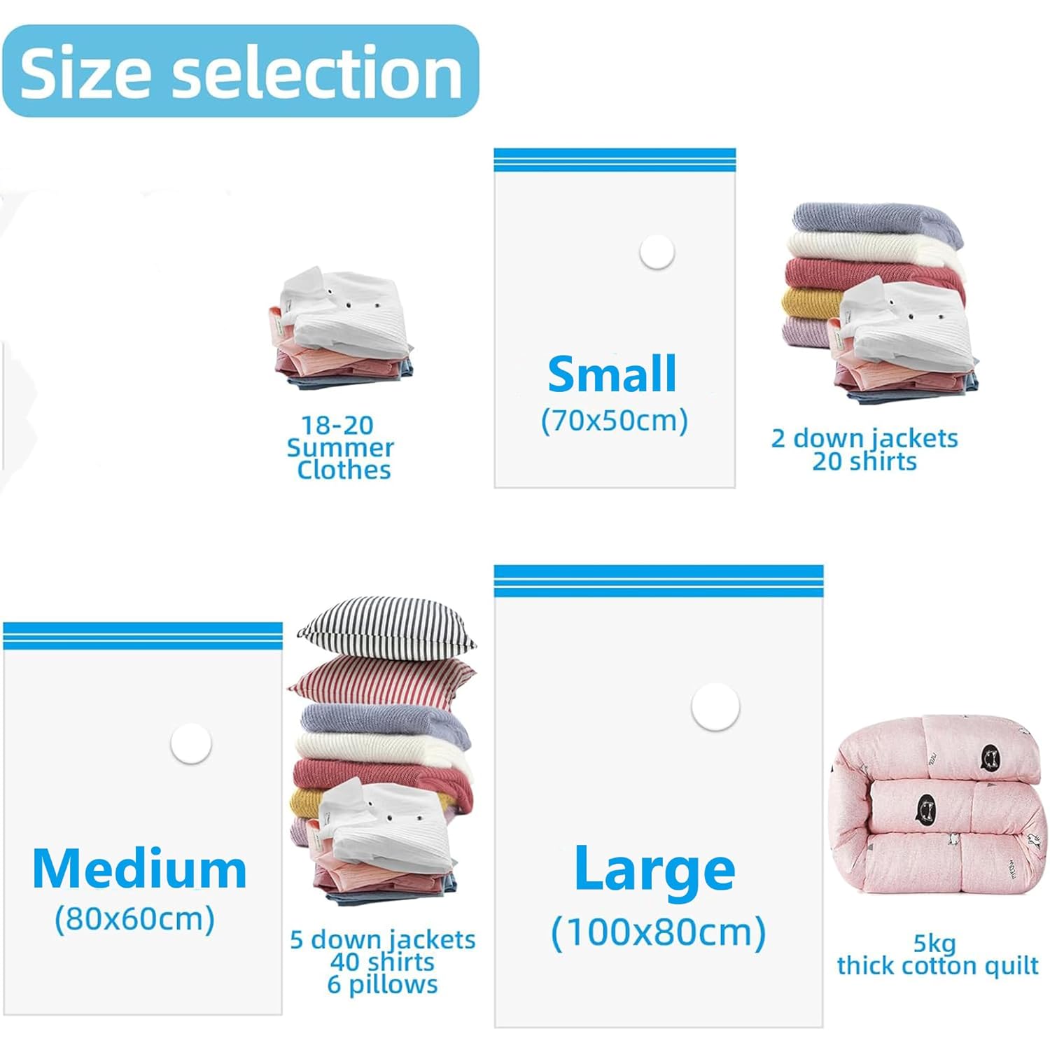 5 Pack Vacuum Storage Bags: Includes a selection of 3 different size vacuum storage bags, Choose between 2 Small Bags 27.5”X 19.5”(70cm X 50cm), 2 MediumBags 31.4” X 23.5”(80cm X 60cm) and 1 Large Bags 39.35” X 31.4”(100cm X 80cm) bags for all your storage needs, 1 Hand pump included to easily vacuum storage your items.